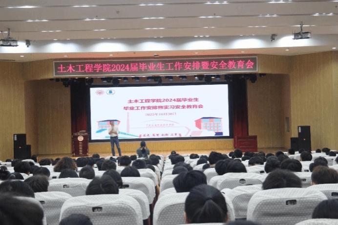 为进一步推进毕业生毕业、实习和就业工作,提高毕业生在实习工作过程中的安全意识,10月30日,土木工程学院在图书馆报告厅召开2024届毕业生工作安排暨实习安全教育大会。土木工程学院党委书记张文风、党委副书记宗宸、徐新贵老师、分管就业工作的辅导员李娟老师、毕业班带班辅导员,以及2024届全体毕业生参加会议。