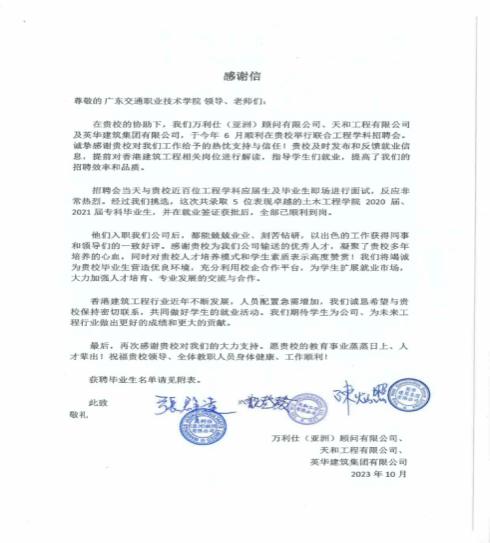 近日,我院收到三家香港企业联名感谢信,感谢我院在香港建筑工程行业人员配置急需增加的情况下提供了大力帮助,及时发布就业信息,引导学生提前对香港建筑工程相关岗位进行解读,组织优秀学子应聘面试,提高了招聘效率和品质,为大湾区高质量发展输送了优质人才。