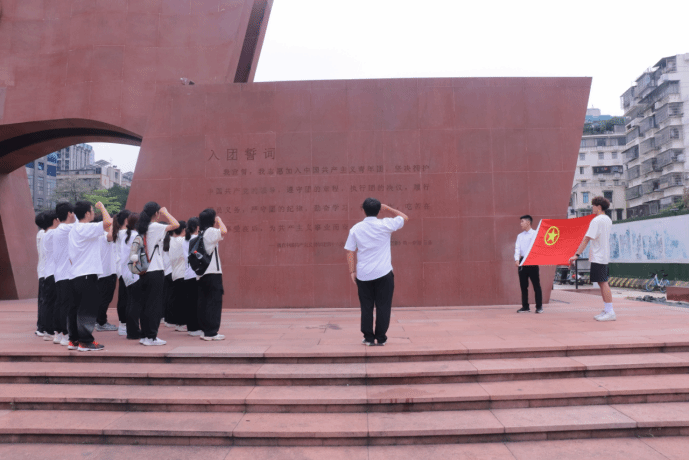 在团一大广场门口,学生团员江浩文带领入团积极分子,在团旗下庄严宣誓,一句句铿锵有力的誓言,引导和激励青年们不忘初心,牢记使命,坚定不移跟党走。