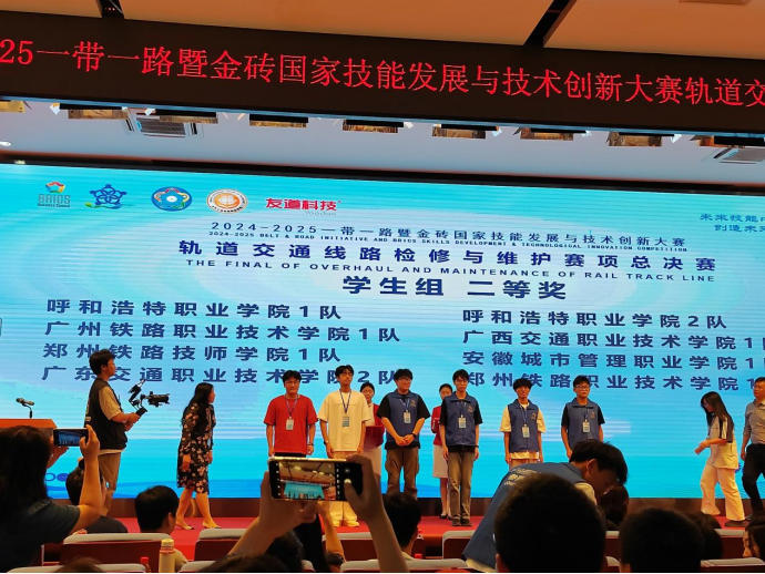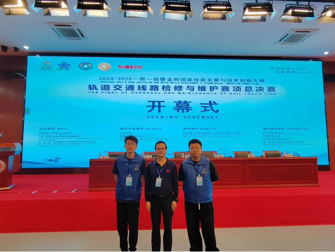 近日,由金砖国家工商理事会中方理事会、一带一路暨金砖国家技能发展国际联盟主办的“2024-2025一带一路暨金砖国家技能发展与技术创新大赛‘轨道交通线路检修与维护’赛项总决赛”在北京交通运输职业学院举行。由土木工程学院蒋英礼和王景梅老师指导、2023级城市轨道交通工程技术专业谭超阳和庄卓竣等同学组成的队伍,与来自国内外的30所学校的38支队伍同台竞技,经过激烈角逐,最终荣获该赛项全国总决赛“二等奖”。
