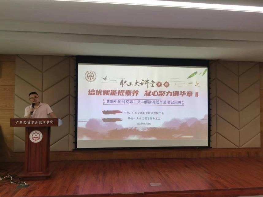 为扎实开展学习贯彻习近平新时代中国特色社会主义思想主题教育,贯彻落实党中央对加强和改进新形势下党的群团工作的重要部署,切实保持和增强党的群团工作的政治性、先进性、群众性,5月8日下午,土木工程学院分工会特邀广东技术师范大学马克思主义学院硕士生导师、副教授张秀峰,在天河校区2#101教室开展了一场深入浅出、精彩纷呈的专题讲座。学院党委委员、副院长熊嘉逸,土木工程学院党委书记张文风、副书记宗宸及部分教职工参加了此次讲座。