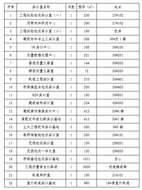 土木工程学院实训基地是学院投资近4000万建设的集教学、科研、培训、对外服务等多功能为一体的校内实训基地。实训基地由工程检测实训基地(包含工程试验检测实训室、建筑材料与土工实训室、土木工程桥梁模型与检测实训室、桥梁基桩检测实训基地、沥青实训室)、工程测量实训基地(包含测量数据处理中心、精密仪器室、普通仪器室)、土木工程软件实训基地、建筑工程技术与管理实训基地(包含BIM实训室、建筑装饰装修实训室、VR实训中心)、轨道交通工程技术实训基地(包含轨道交通技能训练中心、轨道养护室、室外轨道实训基地)组成,总面积近9000m2。